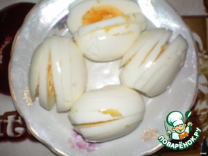 Отварить яйца и нарезать кружочками.
