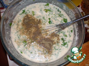Смешать молоко, яйца, соль, перец, петрушку, муку – должно получиться тесто блинной консистенции.