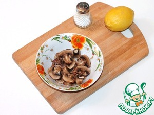 1. Шампиньоны нарезать пластинками, полить лимонным соком (1/4 лимона), посолить, перемешать и оставить мариноваться.