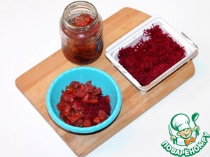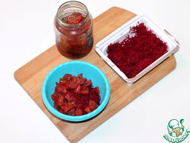 3. Вяленые помидоры нарезать небольшими кусочками. Очищенную свеклу натереть на средней терке и выжать сок. 2 ст. ложки свеклы (без сока) смешать с помидорами.