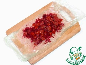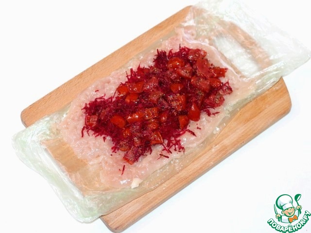 4. Выложить на куриное филе свекольно-помидорную начинку и свернуть в рулет.