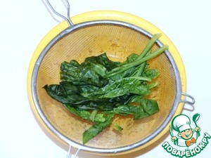7. Шпинат на одну минуту опустить в кипящую воду, затем откинуть на дуршлаг.
