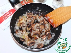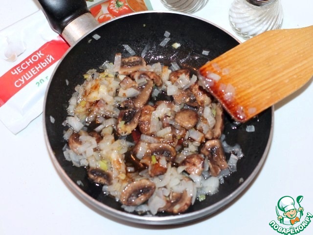 8. Очищенный и мелко порезанный лук обжарить с грибами. Добавить чеснок, паприку, перец и соль.