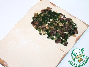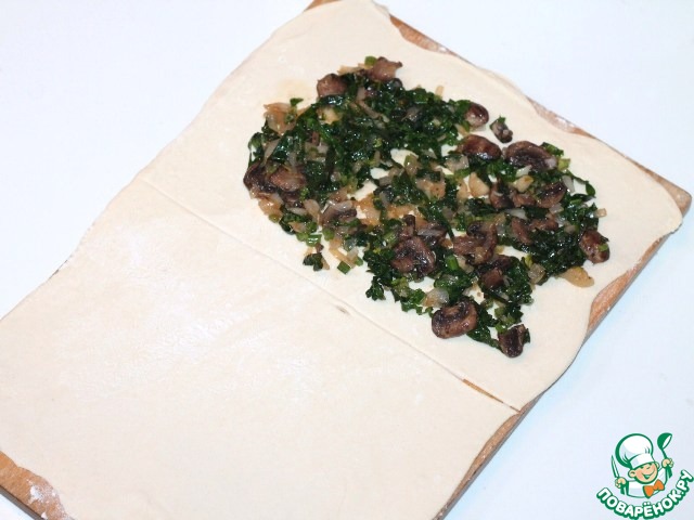 10. Разделочную доску припылить мукой и раскатать 1 пластину теста (в 2 раза). Выложить на одну половину теста начинку и закрыть второй половиной.
