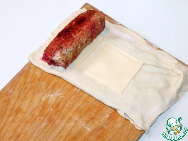 11. Кладем на тесто 2 пластины сыра и курочку, сворачиваем в рулет. Защипываем края.