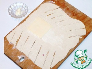 12. Припыляем разделочную доску мукой и раскатываем вторую пластину теста в 1,5 раза. Смазываем середину сливочным маслом, кладем одну пластину сыра и надрезаем край теста на полоски.