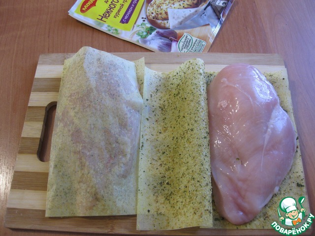 Филе грудки завернуть в лист Магги и обжарить с двух сторон по 5 минут до готовности