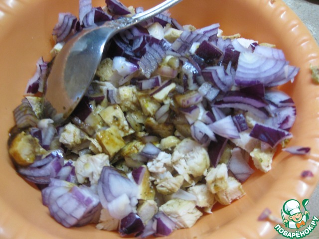 Готовое остывшее филе и лук нарезать небольшим кубиком