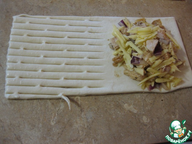 На одну сторону теста выкладываем начинку, второй закрываем, тщательно защипывая края. Я специальным роликом сделала надрезы, - вы можете сделать закрытые пирожки, либо аккуратно ножом сделать несколько насечек. -