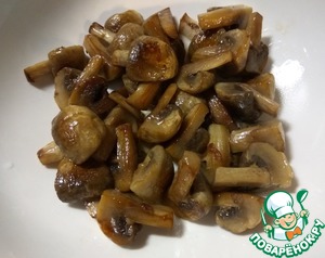 Шампиньоны моем и режем каждый на 4 части. В сковороду сливаем 1 ст. л. подсолнечного масла и хорошо нагреваем. Добавляем шампиньоны и жарим, часто помешивая, на максимально огне в течении 5 минут. Перекладываем грибы с тарелку и даем остыть.