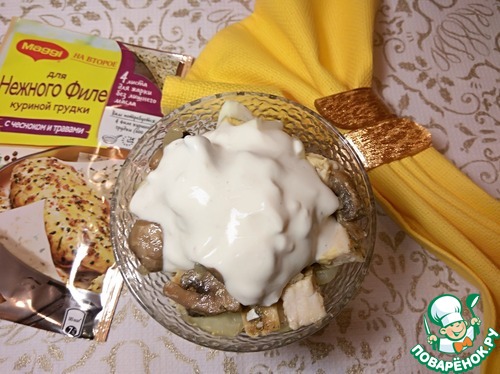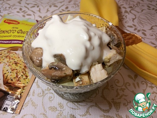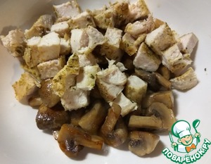 Куриную грудку обжариваем в листе Магги для куриной грудки (с чесноком и травами), снимаем со сковороды и даем остыть. Нарезаем грудку кубиками среднего размера и добавляем к грибам.