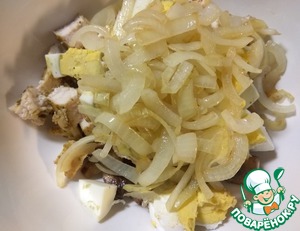 Лук чистим и режем соломкой. Обжариваем в небольшом количестве подсолнечного масла до золотистого цвета. Добавляем к остальным ингредиентам.