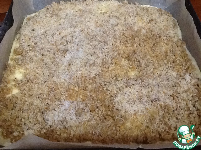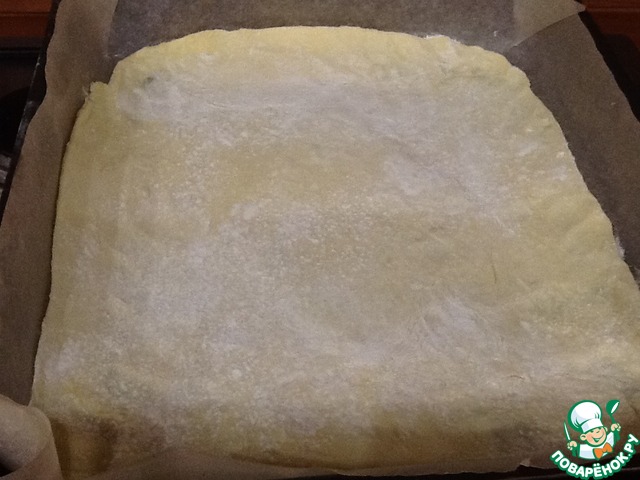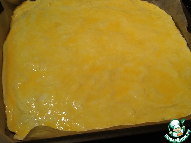 Глубокий противень (у меня 33*40) застелить бумагой для выпечки с бортиками. Одну часть теста тонко раскатываем, переносит на дно противня.