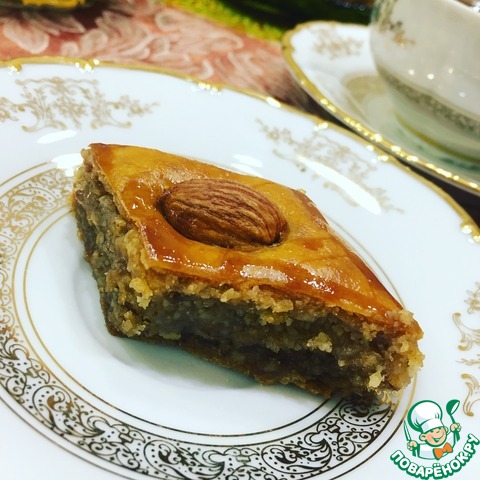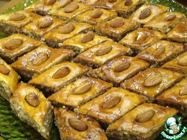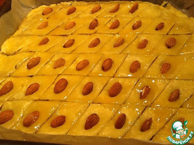 Вынимаем чуть схватившуюся пахлаву, делаем разрезы так чтоб получились ромбы (если так тяжело можно квадраты, но ромбы - классическая форма). И втыкаем в каждый ромбик орешек. У меня миндаль, но чаще это фундук (обжаренный и отшелушенный), можно и половинку грецкого ореха положить. Поливаем чайной ложечкой мед по разрезам, тонкой струйкой, чтоб везде хватило. Убираем в духовку допекаться.