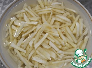 Вслед за луком отправляем топинамбур, порезанный тонким брусочком. Всё вместе обжариваем до готовности.