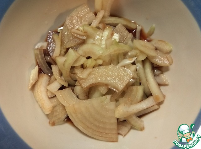 Репчатый лук очистить и нарезать соломкой. Сложить в глубокую миску и замариновать в бальзамическом уксусе на 15 минут.