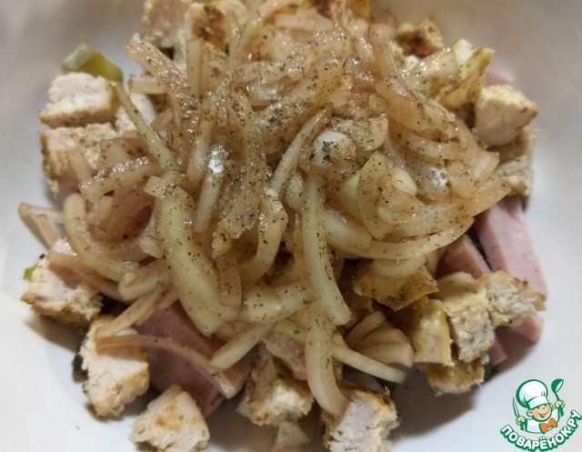 Добавить маринованный лук, посолить и поперчить.