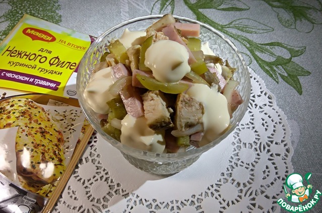 Куриную грудку завернуть в лист для обжарки Магги (с чесноком и травами) и обжарить по 7 минут с каждой стороны. Снять со сковороды и остудить. Пока грудка жарится, нарезать маринованные огурцы соломкой.