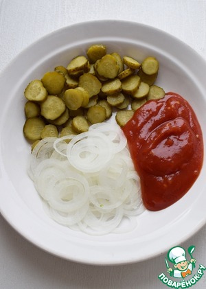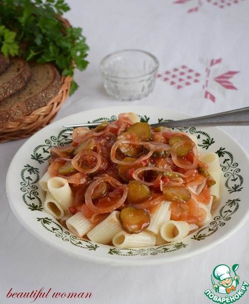 Пока варятся макароны, приготовим заправку: маринованные огурцы нарежем кружочками, лук тонко нашинкуем, добавим вкусный томатный соус и растительное масло. Перемешаем всю эту красоту, если нужно добавим сахар по вкусу.