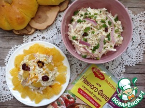 Как правило, планируя меню на ужин, мы отдаём предпочтение в первую очередь блюдам, которые точно понравятся нашим вторым половинкам. Я живу с взрослым сыном и у меня такая же проблема. Он предпочитает мясные и сытные салаты, а я лёгкие и с добавлением фруктов. Этот салат - палочка-выручалочка, так как из базовых ингредиентов можно одновременно приготовить два салата! Попробуйте и вы!