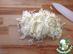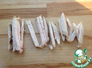 Остывшую куриную грудку нарезать тонкой соломкой.