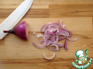 Готовим салат "Для него". В салатник выложить половину базового салата, оставшийся красный лук и курицу, добавить майонез, перемешать, посыпать мелко нарезанной зеленью и поперчить.