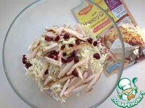В миску добавить пекинскую капусту, вяленую клюкву, по 3/4 части красного лука и куриной грудки. Перемешать.