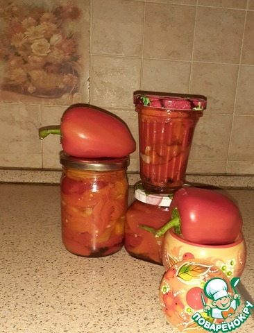 Наверное, я уже опоздала с этим рецептом, но на будущий год, надеюсь, кому-нибудь, да пригодится. Когда закрыты банки с любимыми рецептами, а перец все не заканчивается), или, как у меня - муж поехал за хлебом, а привез 11 кг перца! Перчик получается очень вкусный, очень чесночный, за обедом в душевной компании банка "улетает" моментально!
