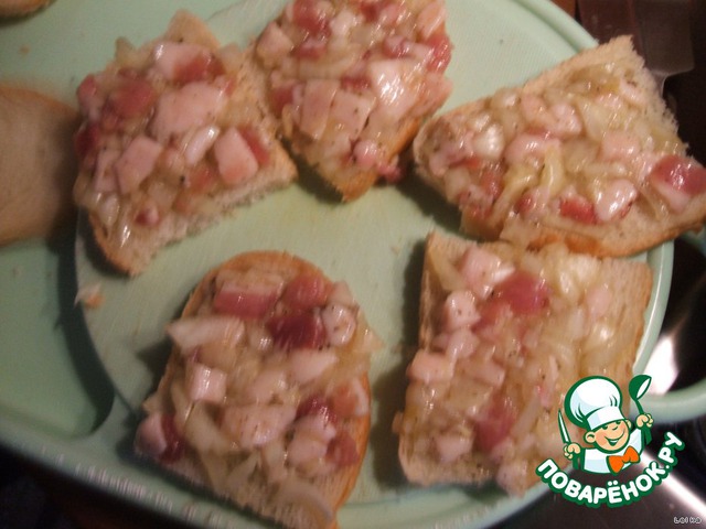 Сало и лук мелко порезать, влить яйцо, добавить соль и перец по вкусу. Всё перемешать. Выкладываем начинку на хлеб.