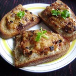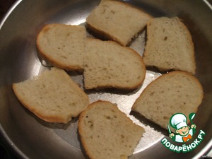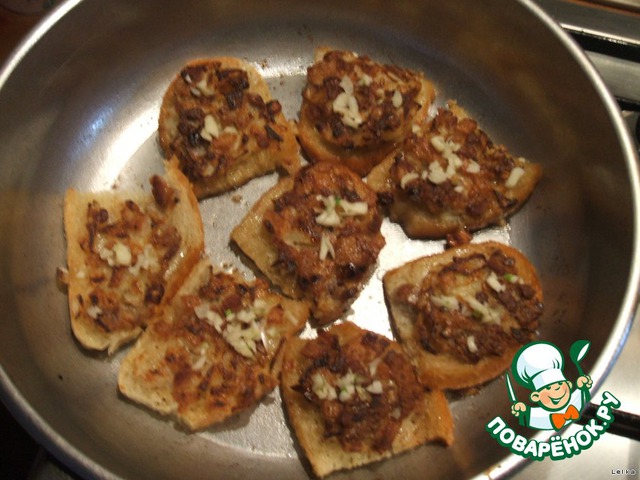 Аккуратно переварачиваем гренки и немножко поджариваем с другой стороны. В конце сверху добавляем чеснок.