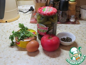 Подбираем ингридиенты. Варим яйцо, открываем банки с корнишонами и печенью трески, моем петрушку, помидор, промываем каперсы.