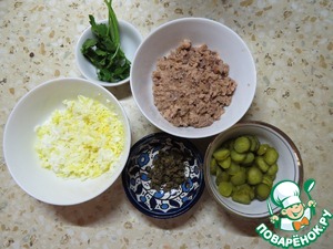 Печень трески мнем вилкой, но не до состояния паштета - должны остаться кусочки, вареное яйцо трем на самой мелкой терке, петрушку моем и отделяем самые грубые стебли, корнишоны режем колечками, каперсы просто мельчим.