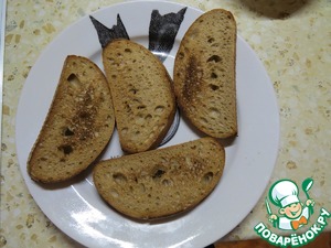 Т. к. я готовлю на двоих, отрезаю от чиабатты 4 кусочка и сушу их на сухой раскаленной сковороде. С двух сторон.