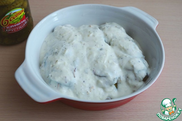 В форму для запекания добавить филе минтая, добавить сверху нарезанные пластики маринованных огурцов, добавить 2 ст. ложки растительного масла