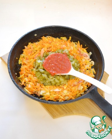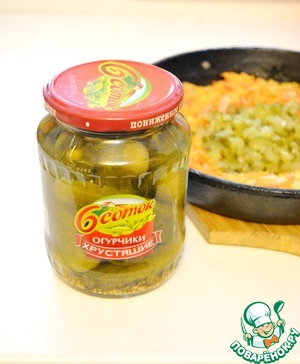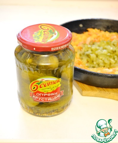 Хрустящие огурчики "6 соток" также нарежьте мелко и добавьте к овощам, поджарьте их вместе с овощами еще немного (около 5 минут) -