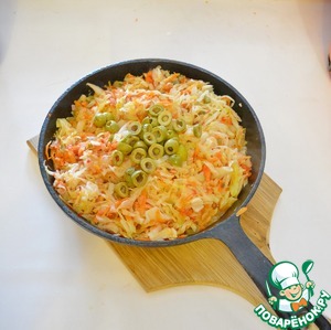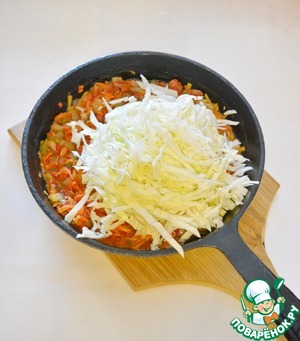 Капусту нашинкуйте и добавьте в сковороду, где обжариваются овощи. Готовьте капусту буквально пару минут, чтобы она просто "осела"