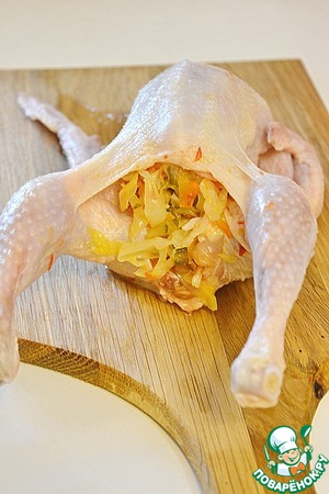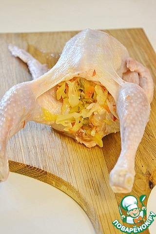 Цыпленка нафаршируйте этой капустной солянкой, отверстие скрепите зубочисткой, ножки свяжите ниткой