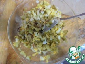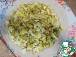 Для начинки соединить нарезанные яйца, обжаренный лук и нарезанные маринованные огурцы. При необходимости посолить, поперчить по вкусу. Перемешать.
