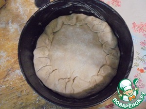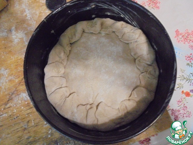 Тесто разделить на 2 части ( одна часть чуть поменьше). Раскатать большую часть и выложить в разъемную круглую форму. Сверху выложить начинку, оставив свободными края теста.