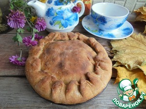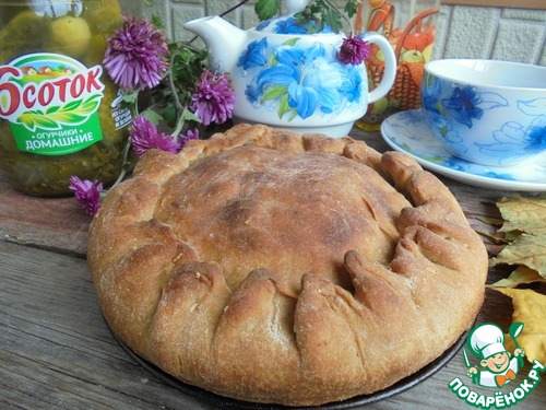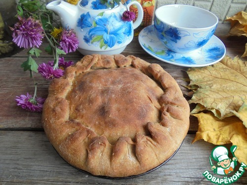 Раскатать вторую часть теста, выложить сверху на пирог. Оставшиеся свободными края нижнего пласта собрать сверху складочками. Дать постоять пирогу в теплом месте 20 минут.