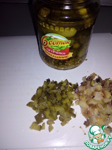 • Огурцы и скумбрию режем мелким кубиком.