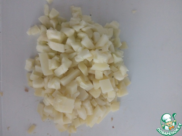 Яблоко очищаем от кожуры, сердцевины и семян. Режем мелким кубиком вместе с картофелем. Зелень лука мелко рубим.