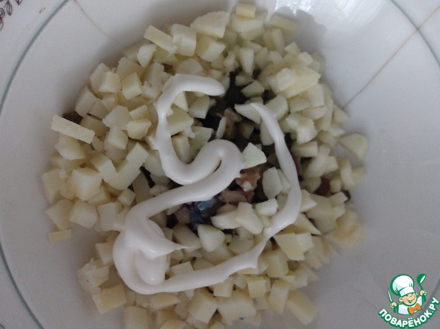 Смешиваем все ингредиенты, заправляем майонезом. Даем настояться в течении 1 часа. При подаче посыпаем горошком и рубленной зеленью лука.