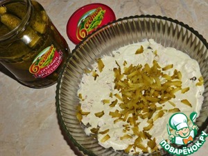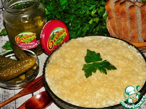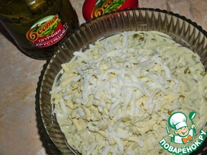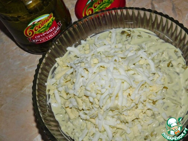 Вторым слоем натираем на терке маринованные огурцы. И тоже смазываем майонезом.