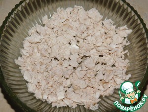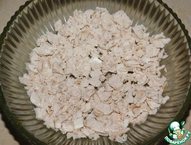 Куриное филе сварить, остудить и мелко нарезать. Выложить на дно салатника. Смазать слой майонезом.