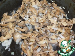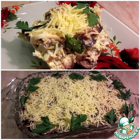 Шампиньоны обжариваем с, мелко нарезанным, луком. Остужаем. Выкладываваем грибы поверх яичного слоя. Смазываем майонезом.