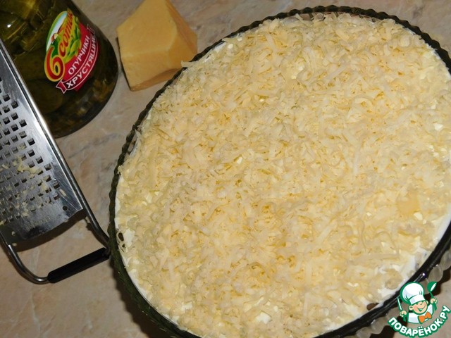 Сверху посыпаем салат тертым сыром и ставим в холодильник. Даем ему пару часов, чтобы он пропитался.