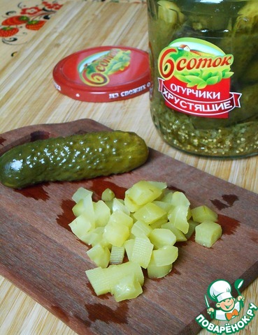Нарезать маринованные огурцы. Я очистила их от кожицы, но это необязательно.
