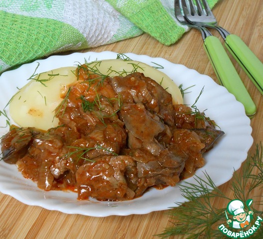 Моя семья очень любит азу. Однажды мне пришло в голову приготовить подобное блюдо с куриной печенью, которую мы тоже очень любим. Я использовала маринованные огурцы, которые прекрасно сочетаются с печенью. Получилось очень вкусно!