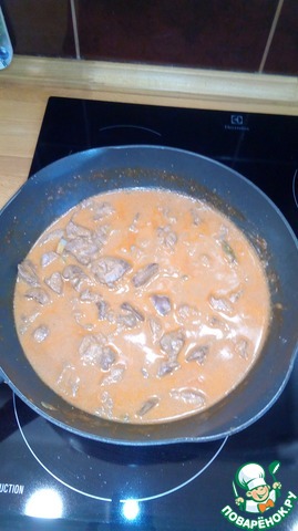 Добавляем огурцы к печени, добавляем томатную пасту и тушим 3-5 минут. Добавляем черный молотый перец, соль по вкусу.